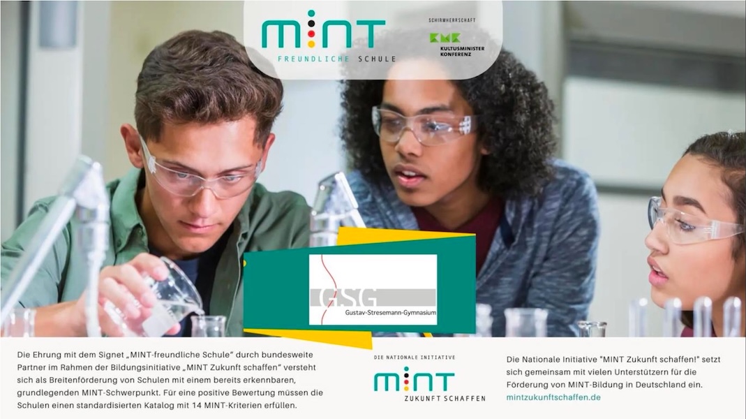 Anhand zahlreicher Kriterien konnten sich die Juroren unter der Schirmherrschaft der Kultusministerkonferenz vom besonderen Stellenwert überzeugen, der dem MINT-Bereich am GSG zukommt. Dabei überzeugten nicht nur die curriculare Schwerpunktbildung mit Angeboten wie dem ICDL oder Praktische Informatik im Wahlpflichtunterricht, sondern auch das umfangreiche MINT-bezogene AG-Angebot für die gesamte Mittelstufe wie die AG "Medienwelten" von Herrn Wendring in den Jahrgängen 5 und 6, die NaWi-AG im Jahrgang 7 bei Herrn Rüsseler oder der Makerspace im ehemaligen Fotolabor. Außerdem profitieren die Schülerinnen und Schüler am GSG von vielfältigen MINT-bezogenen Events und Veranstaltungen.